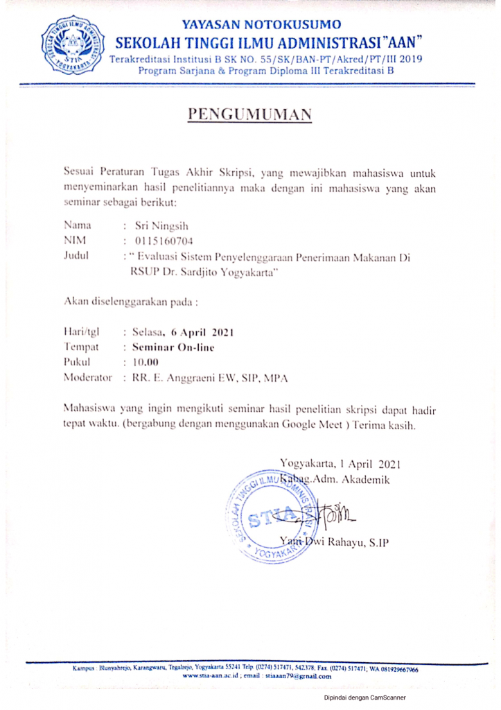 Link GMeet Seminar Hasil Penelitian Skripsi :Hari Selasa 6 April 2021Pukul 10:00 WIB https://meet.google.com/ugu-txfw-eaz Atas nama Sri NingsihModerator : RR. E. Anggraeni EW , SIP,MPAHost : Akademik